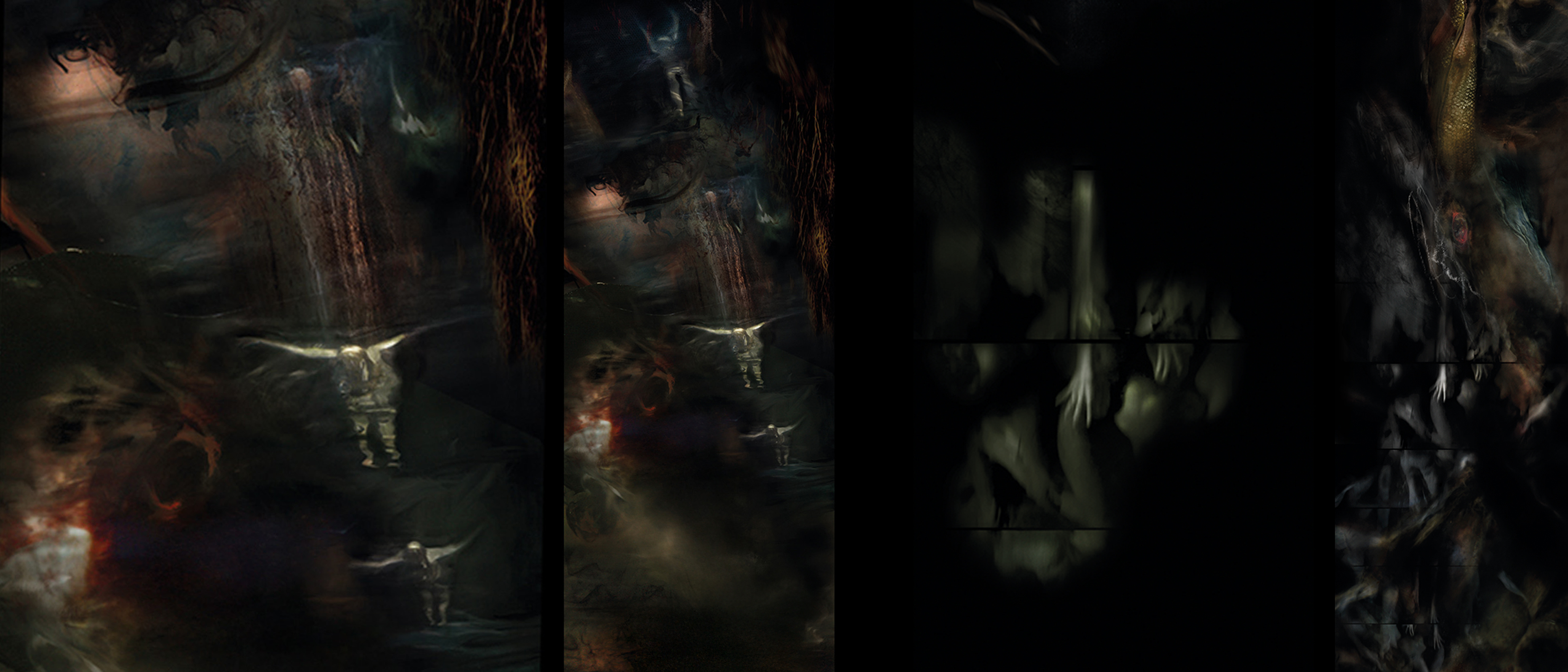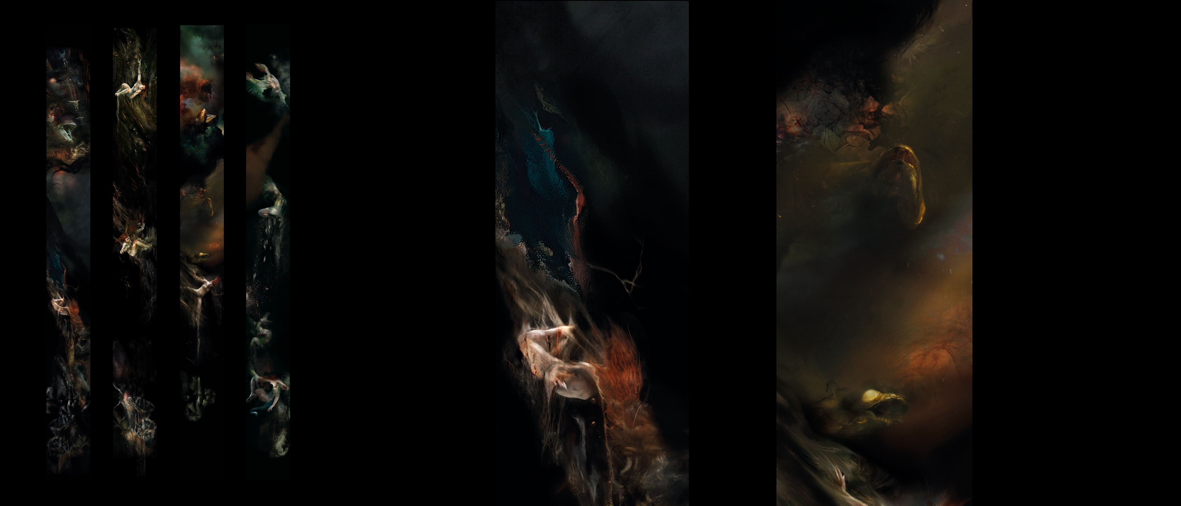 "Ward’s ongoing concerns with metamorphosis, falling, light, fear, memory, darkness and the transformative moment have led him to create a series of vast, physically imposing works that delve into other-worldly landscapes and transcendent states, to evocations of loss, redemption and unconscious realms."